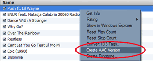 6. Doğru başlangıç-bitiş saniyelerini belirledikten sonra iTunes ana ekranından yine seçtiğiniz şarkının üzerine sağ tıklayın ve ‘Create AAC version’ seçeneğine tıklayın. iTunes’un bir önceki sürümünde tıklamınız gereken seçenek ‘Convert Selection to AAC’ olacaktır.